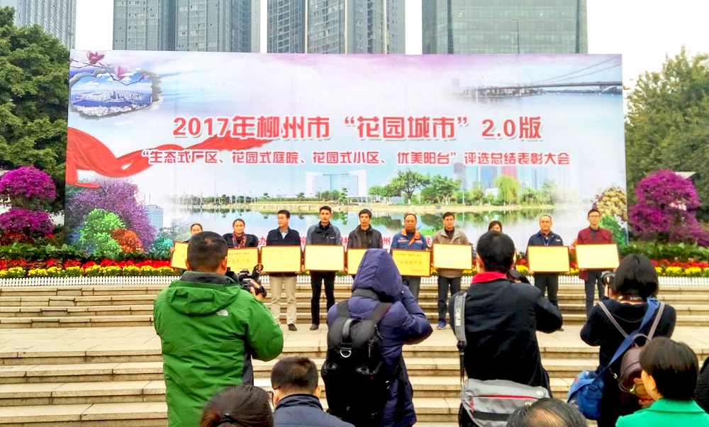 2017年12月27日,司能石油化工有限公司(以下簡稱“司能石化”),經柳州市陽和規劃建設環保局、園林局等外部上級環保部門,以在柳州市人民廣場召開“2017年柳州市‘花園城市’2.0版——‘生態式廠區、花園式小區、優美陽臺’評選總結表彰大會”的方式,不僅授予了我司“生態式廠區”榮譽牌匾,還另外贈送了“雙層三角梅、水紅三角梅、紫薇(花瓶式)、綠寶、粉花凌霄、炮仗花、龍吐珠”等價值約3000多元的名貴盆栽共計15盆,并對我司綠化工作人員的辛勤工作予以肯定。